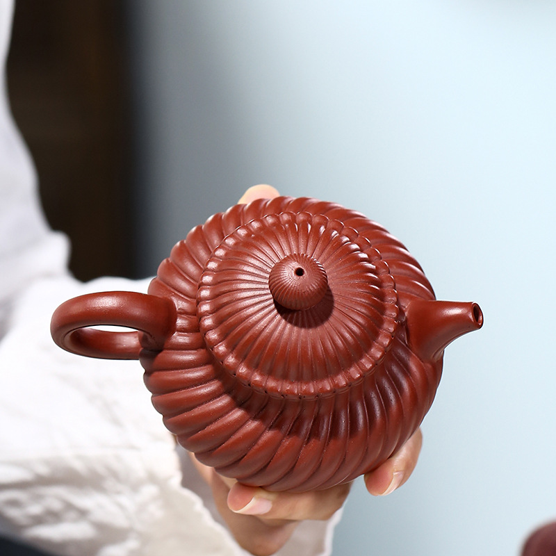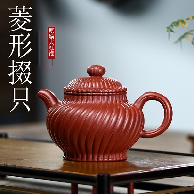 大紅袍南瓜瓣壺原礦紫砂仿古筋紋合菱壺