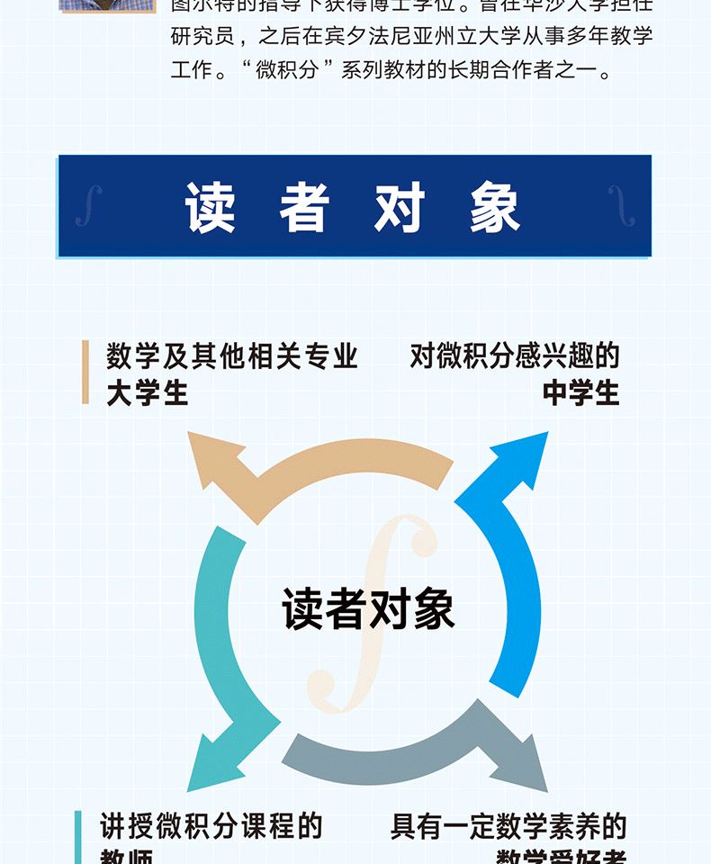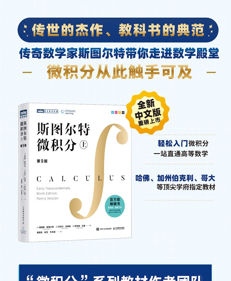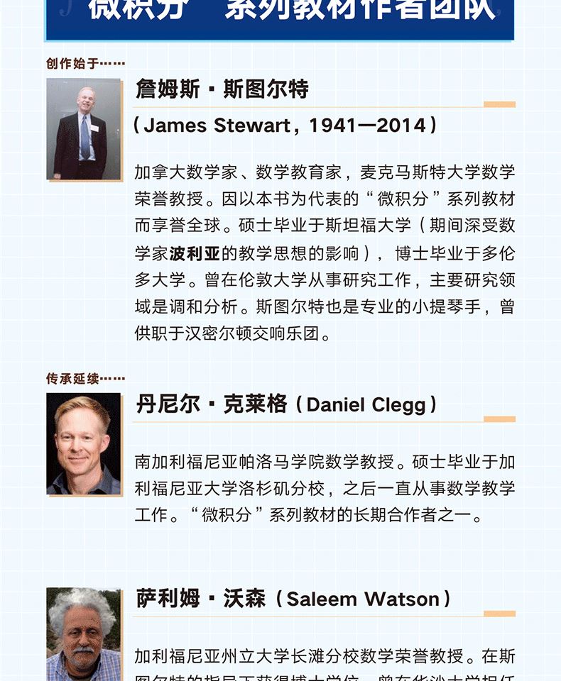 詹姆斯‧斯圖爾特(James Stewart,1941—2014),加拿大數學家、數學教育家,麥克馬斯特大學數學榮譽教授。因以本書為代表的「微積分」系列教材而享譽 。碩士畢業於史丹佛大學(期間深受數學家波利亞的教學思想的影響),博士畢業於多倫多大學。曾在倫敦大學從事研究工作,主要研究領域為調和分析。斯圖爾特也是的小提琴手,曾任職於漢密爾頓交響樂團。克萊格(Daniel Clegg),南加州帕洛馬學院數學教授。碩士畢業於加州大學洛杉磯分校,之後一直從事數學教學工作。 「微積分」系列教材的長期合作者之一。薩利姆·沃森(Saleem Watson),加州州立大學長灘分校數學榮譽教授。在斯圖爾特的指導下獲得博士學位。曾在華沙大學擔任研究員,之後在賓州州立大學從事多年教學工作。 「微積分」系列教材的長期合作者之一。