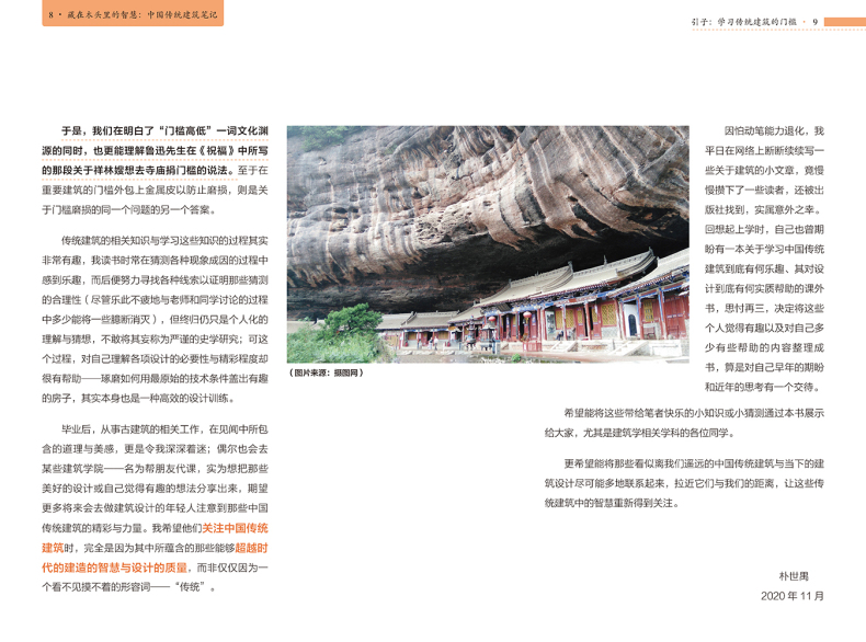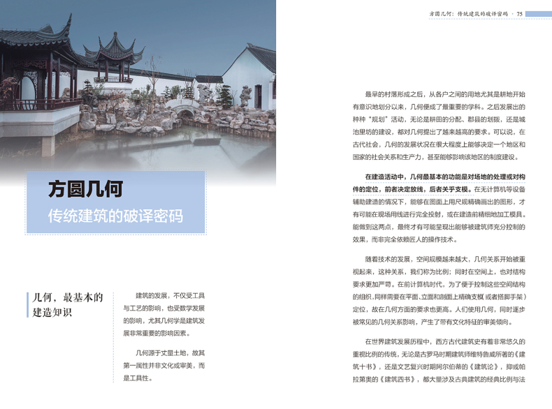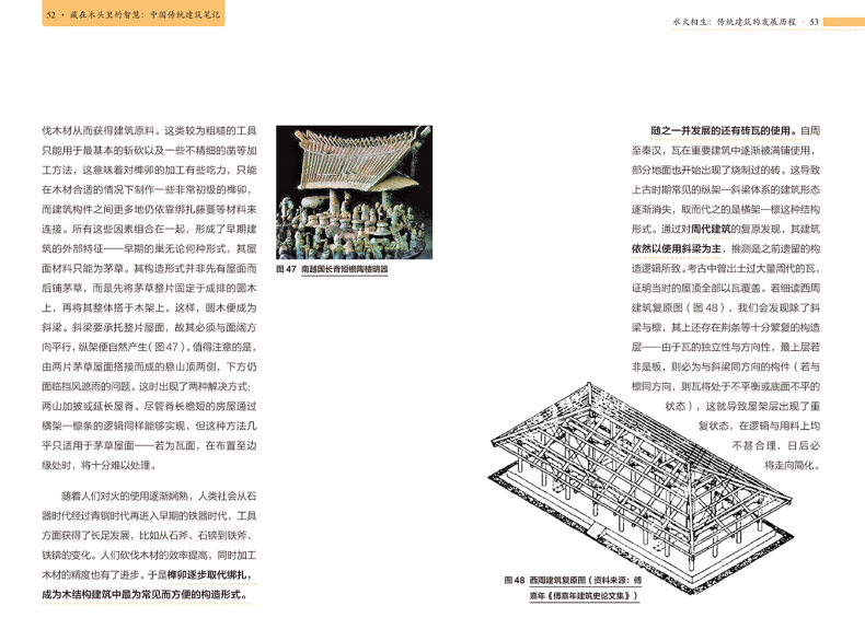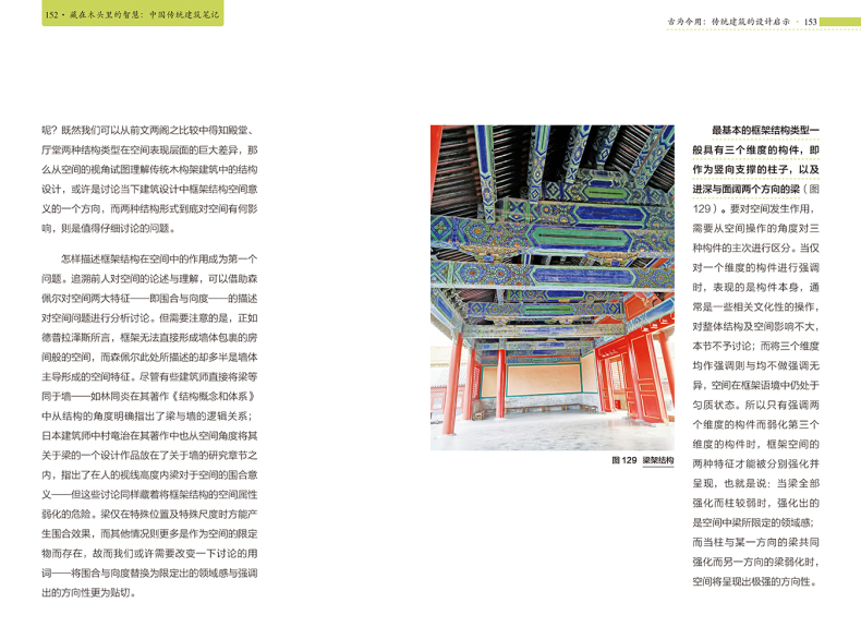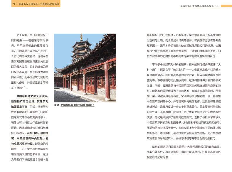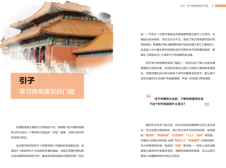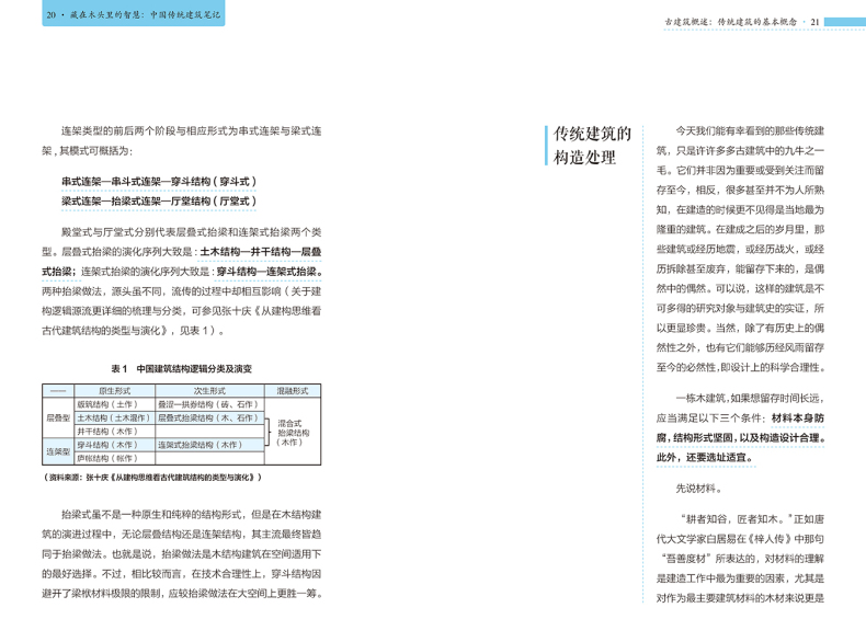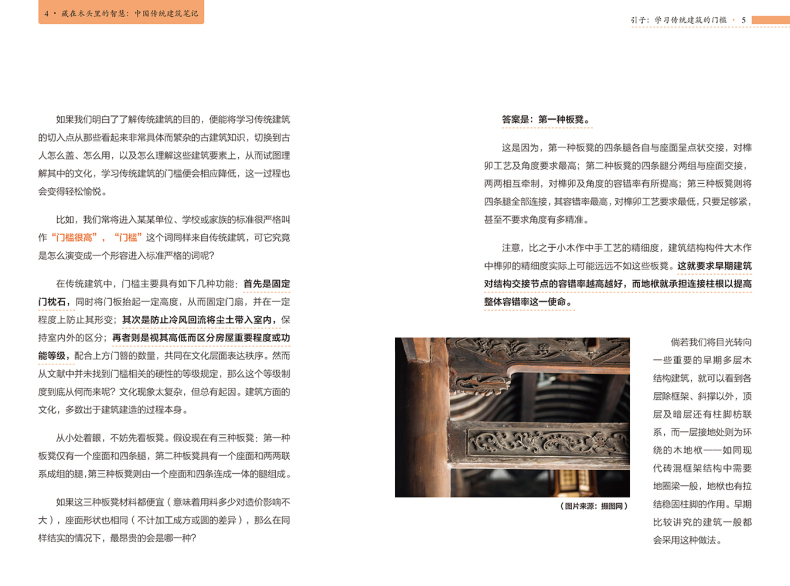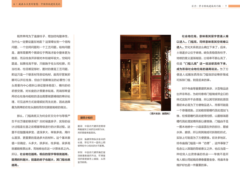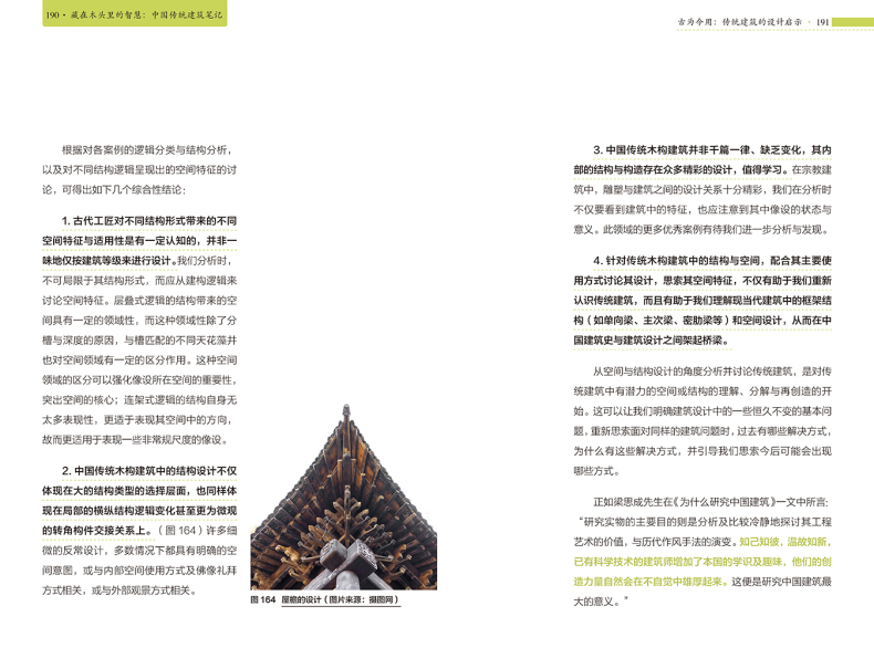 本書沒有落於介紹具體建築的窠臼,而是從大處著眼,從傳統建築的建造邏輯入手,巧妙地分析了古人為什麼這樣建造的原因,並詳細解釋了建築隨技術發展而出現的變化,讓讀者在理解了傳統建築內部構造的同時,深深嘆服於中國古人的智慧。正如作者在前言中所說,希望大眾在關注中國傳統建築時,不僅是因為“傳統”,更因為其中所蘊含的那些能夠超越時代的建造的智慧與設計的質量。