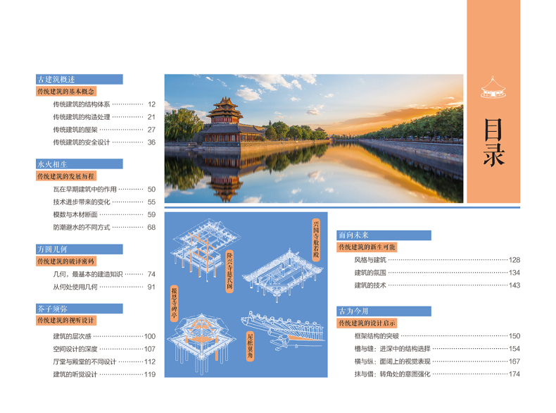 本書講述了中國傳統建築的結構體系、製造技巧和風格沿變等內容,分別從傳統建築的基本概念、發展歷程、破譯密碼、視聽設計、新生可能和設計啟示等角度入手,具體講解了傳統建築的構造處理、空間設計的層次感以及聽覺設計等,回顧並分析了中國傳統建築的發展,特別是技術進步帶來的變化,解構現當代建築與傳統建築在風格、技術等方面的關聯,分析了中國現當代建築對古建築的傳承與發展,並展望了傳統建築的技藝在未來應用的前景。