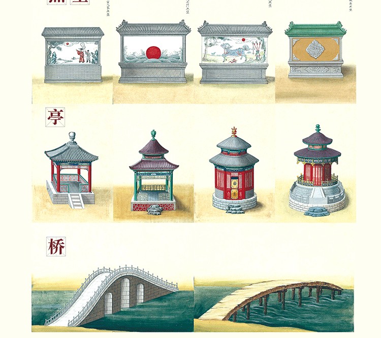 工具—磚瓦—牆—照屏—亭子—橋—塔;住宅的單層—雙層—三層—室內—台。從小到大,由簡至繁,宏觀的佈局+局部的細描,彩繪圖資料來源多樣,圖面信息綜合。畫中建築是真實與想像並存的,這樣能夠展示的是更具有典型意義和足夠內涵的“中國建築”。