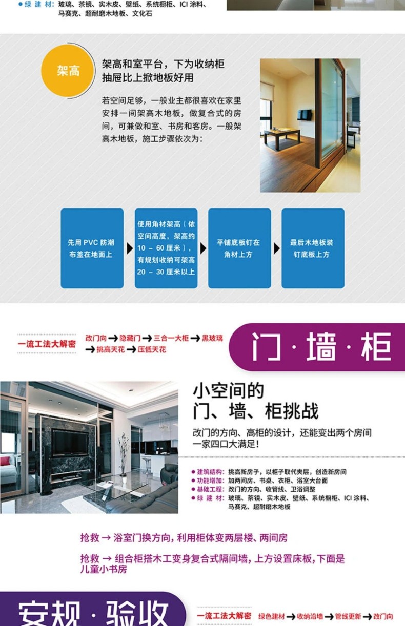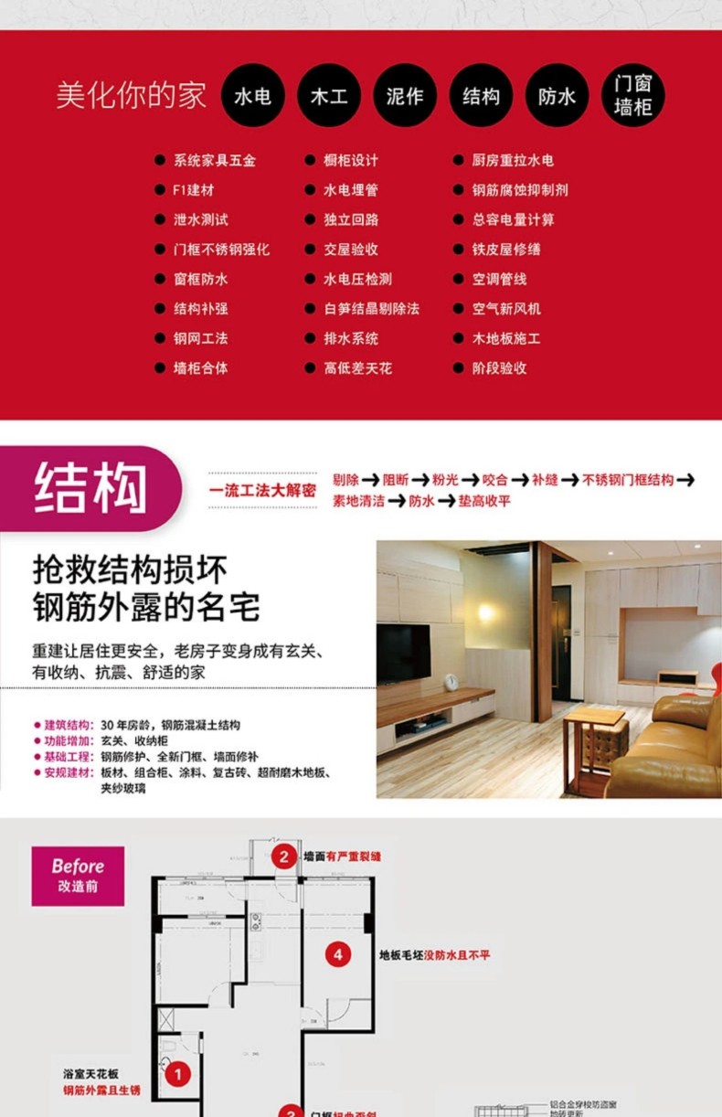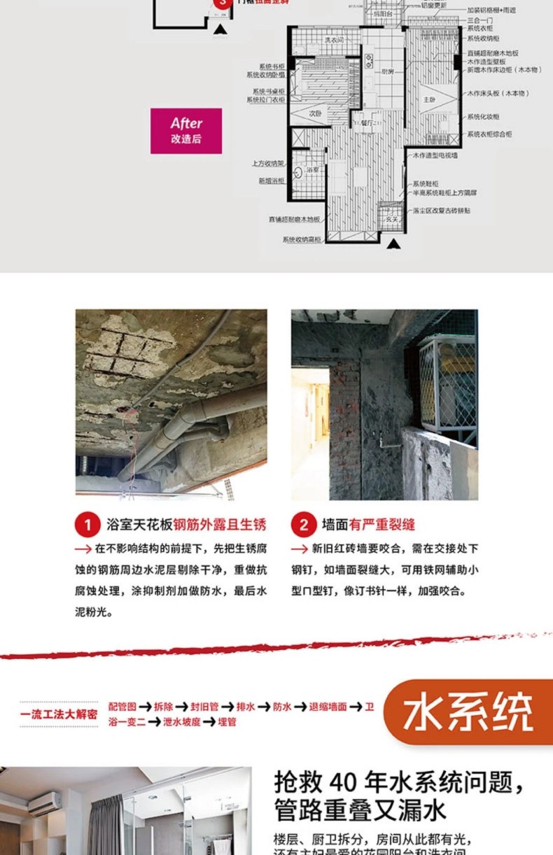 真實案例示範:解決提案+施工流程。 實戰面對屋齡超過30年以上問題百出的透天住宅、長型公寓、挑高住宅、老式電梯高層住宅、甲醛過多,只要碰到難題發生,一定要請多位師傅來評估,經驗不同才能找 出好的方法。