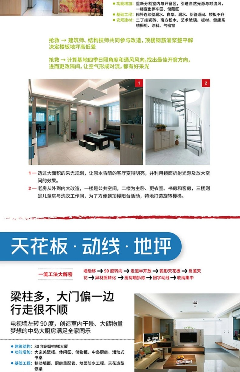 每個部分中作者都選擇至少一例自己親身設計的作品,詳加分析,並提供照片、草圖和技術圖紙等多種材料,對比裝修(改造)前後的巨大差別,使讀者能深刻理解裝修設計的重大 意義和內涵,“讓空間有溫度、能呼吸”,創造出舒適宜人的居住和生活環境。
