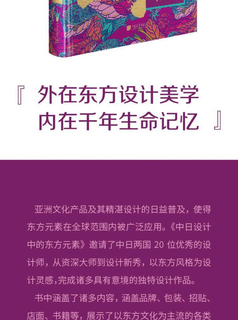 亞洲文化產品及其精湛設計的日益普及,使得東方元素在全球範圍內被廣泛應用。 《中日設計中的東方元素》邀請了中日兩國20位優秀的設計師,從資深大師到設計新秀,以東方風格為設計靈感,完成諸多具有意境的獨特設計作品。