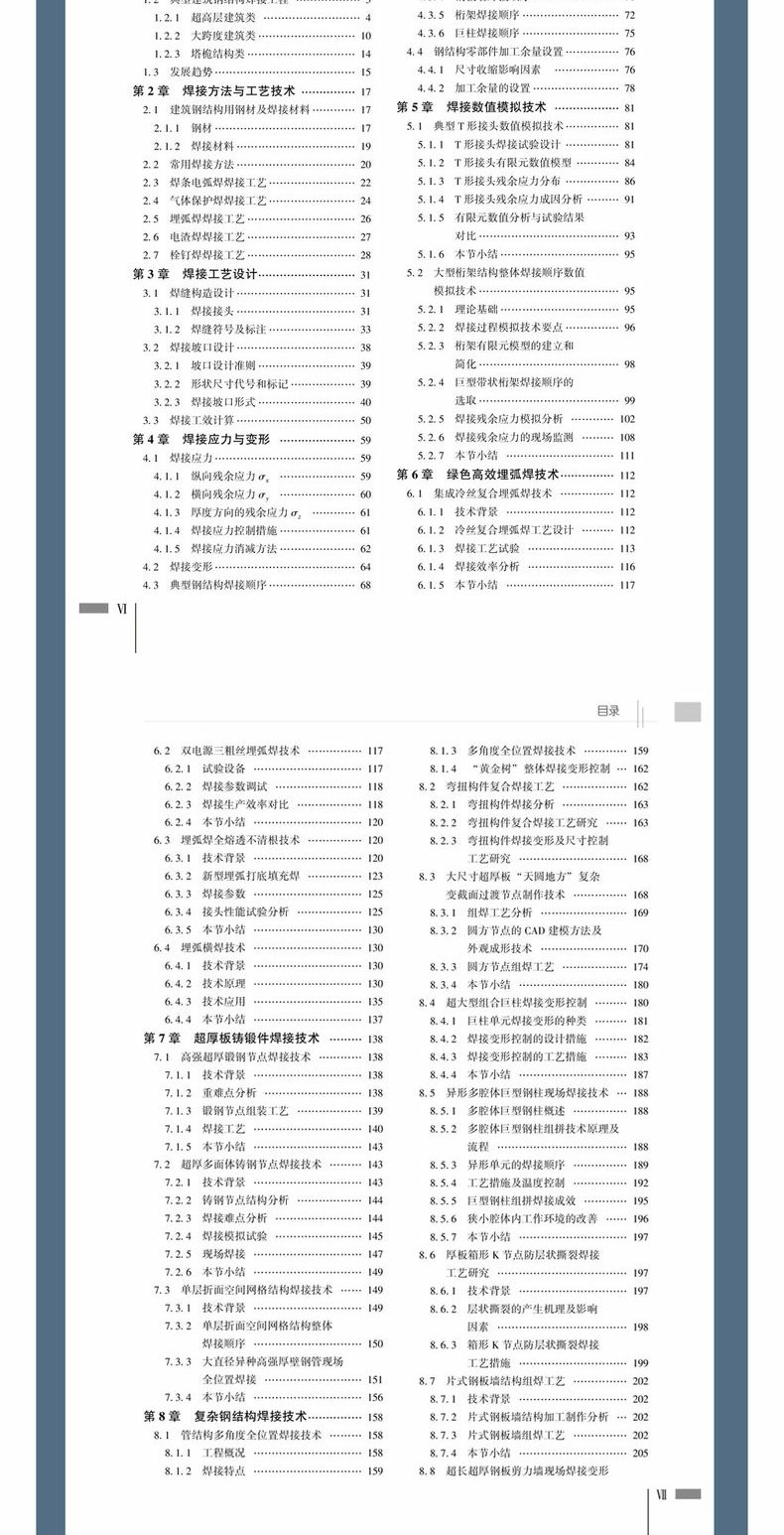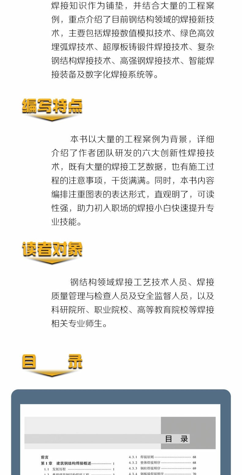 本書共12章,以焊接方法與製程技術、焊接製程設計、焊接應力與變形等基本焊接知識作為鋪墊,並結合大量的工程案例,重點介紹了目前鋼結構領域的焊接新技術,主要包括焊接數值模擬技術、綠色高效埋弧焊技術、超厚板鑄件焊接技術、複雜鋼結構焊接技術、高強度鋼焊接技術、綠色高效能埋弧焊技術、超厚板鑄件焊接技術、複雜鋼結構焊接技術、高強度鋼焊接技術、智慧焊接技術、新焊接系統等設備。本書的出版將有利於鋼結構焊接領域新技術的推廣與普及,進一步推動新質生產力的發展。