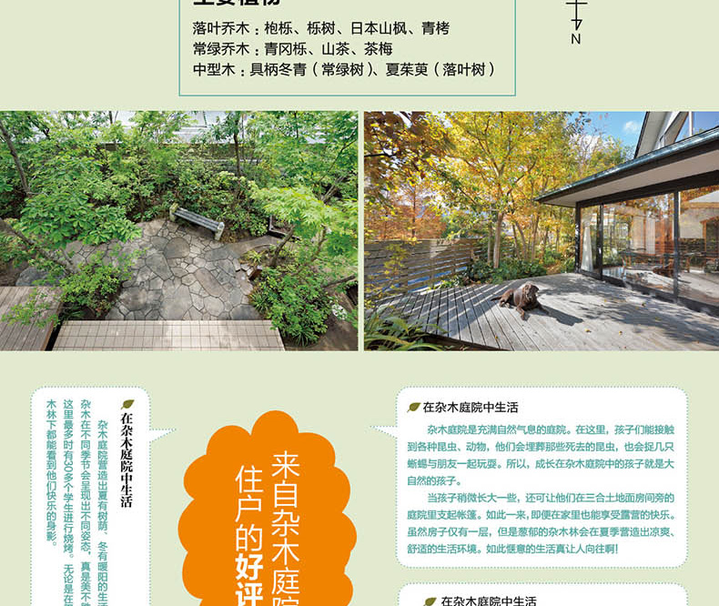 本書以十餘個家庭的雜木庭院為例,向讀者介紹了多種類型的家庭雜木庭院。同時對利用雜木打造舒適的現代生活環境的概念與方法進行了闡述,並對雜木庭院的維護與管理進行了講解。書後附植物圖鑑,向讀者展示了適於在雜木庭院中種植的常見樹木與雜草。