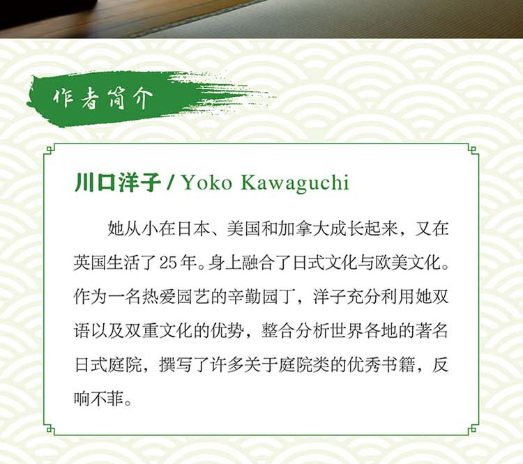 川口洋子(Yoko Kawaguchi),身上融合了日式文化與歐美文化。她從小在日本、美國和加拿大成長起來,又在英國生活了25年。作為一名熱愛園藝的辛勤園丁,洋子充分利用她雙語以及雙重文化的優勢,整合分析世界各地的著名日式庭院,撰寫了許多關於庭院類的優秀書籍,反響不菲。