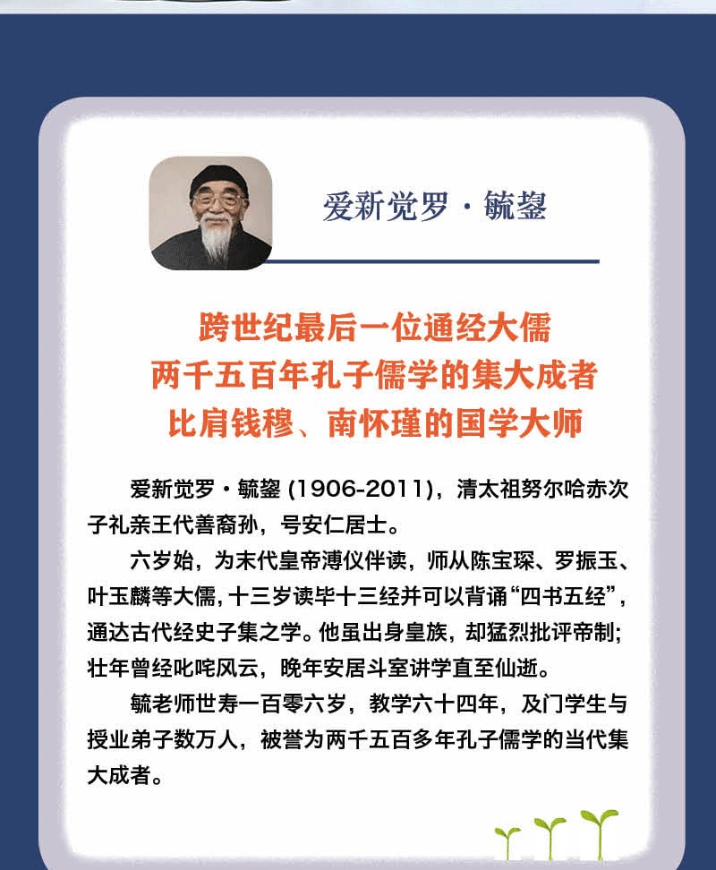 愛新覺羅·氍鋆(1906-2011),清太祖努爾哈赤次子禮親王代善十一世裔孫,號安仁居士。 自幼受宮廷教育,為末代皇帝溥儀伴讀,師從陳寶琛、羅振玉、葉玉麟等,私淑熊十力,終成一代。 斃老先生創辦天德黌舍、奉元書院,以《易經》為體,據《春秋》為用,縱論四書五經及先秦兩漢諸子,立下「以夏學奧質,尋諱世 真文」的宏願,受教弟子有林義正、劉君祖、蔣勳等學界名家。 一生倡導世致用之學,為四書五經、諸子百家注入了時代生機。