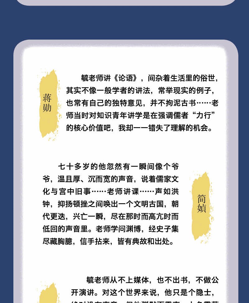 七十多歲的他忽然有一瞬間像個爺爺,溫且厚、沉而寬的聲音,說著儒家文化與宮中舊事……老師講課……聲如洪鐘,抑揚頓挫之間喚出一個文明古國, 朝代 更迭,興亡一瞬,盡在那時而高亢時而低迴的聲音裡。 老師學問淵博,經史子集盡藏胸臆,信手拈來,皆有典故和出處。