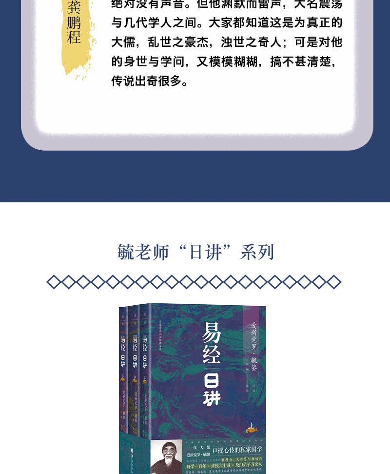 《易經日講》是根據氍老師課堂講授之筆記整理而成。 氍老師解經遵循儒家經學傳統,以依經解經和一字一義的講解方式,重視經典的經世致用之義,既能靈活地結合歷史、政治、人文等主題,又能與當下融會貫通, 高度還原經典的哲學內蘊與思想力量。 氍老師的解說,將《易經》歸於儒家修、齊、治、平的價值體系,還原儒家經典的哲學內蘊和思想力量,同時結合自己對人生世相的切身感受,使讀者清楚了解經典之 真義,實用之價值,從而啟發現代人運用經典的智慧引導人生。