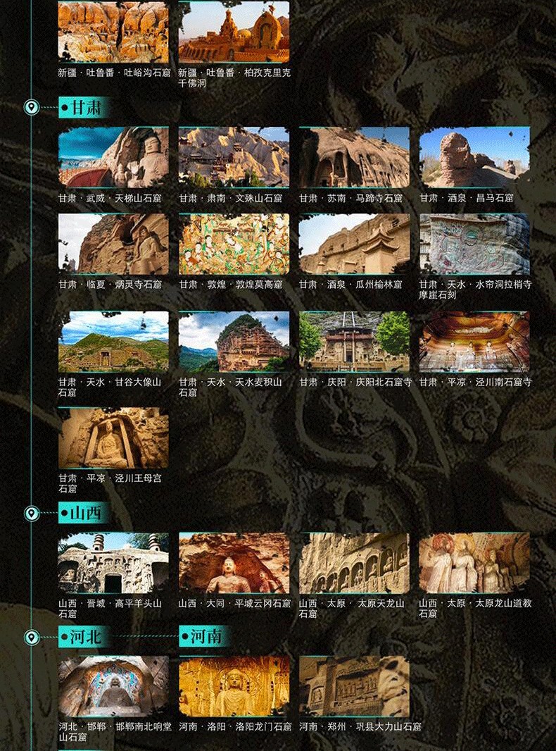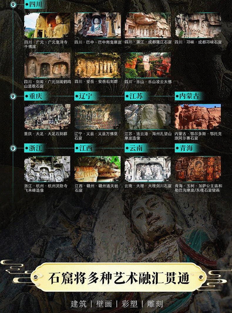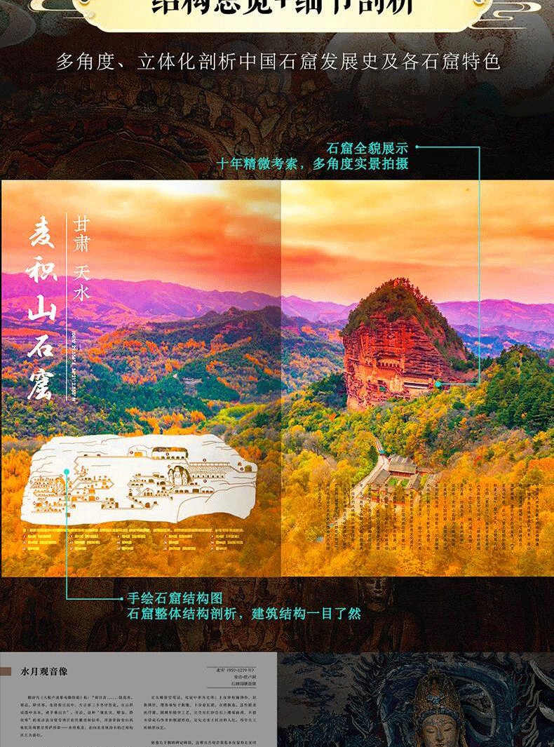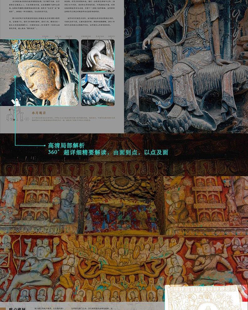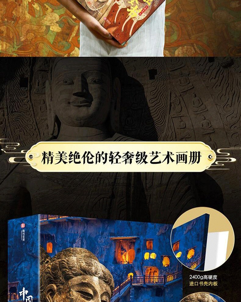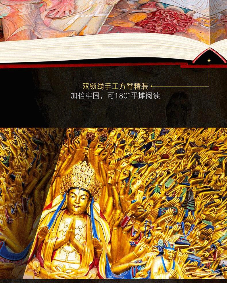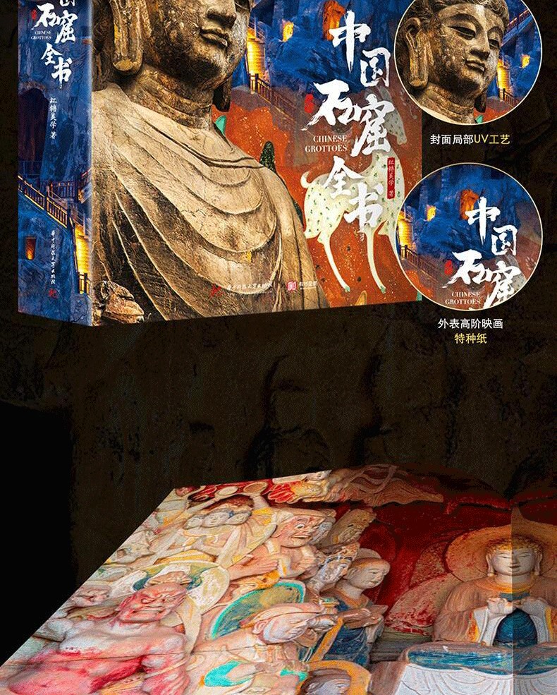 《中國石窟全書》,書中主要描述了中國石窟藝術的發展史,並舉例介紹極具民族特色的中國石窟藝術。書中以石窟藝術作為載體,詳細描繪了中國石窟藝術的綿亙千年歷史,此外,還囊括了富麗多彩的石窟壁畫,含佛經故事、山川景物、亭台樓閣等建築畫、山水畫、花卉圖案、飛天佛像以及當時勞動人民進行生產的各種場面等,是十六國至清代1600多年的民俗風貌和歷史變遷的藝術再現,雄偉瑰麗。