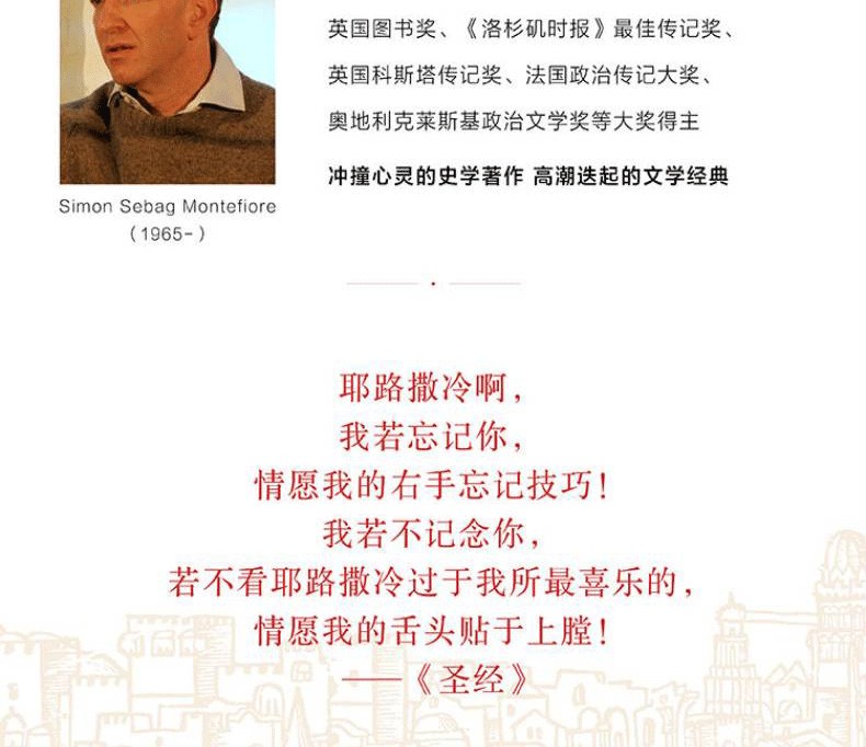 西蒙·蒙蒂菲奧里以客觀、中立的角度,依年代順序,生動講述了耶路撒冷的故事。透過士兵與先知、詩人與國王、農民與音樂家的生活,以及創造耶路撒冷的家族來呈現這座城市的三千年瑰麗歷史,還原真實的耶路撒冷……