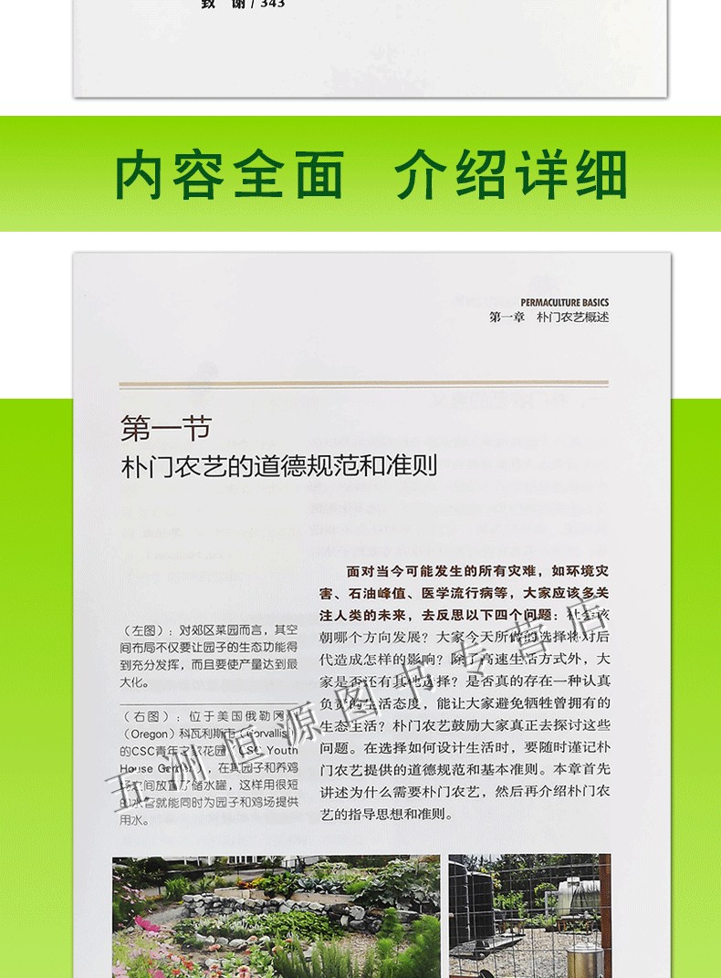 《實用樸門農藝》第一章內容是樸門農藝概述,向大家介紹樸門農藝的基礎知識,包括樸門農藝的內涵和朴門農藝背後蘊含的道德準則。另外,這一部分還介紹了基本的地球科學知識,為下一階段的設計規劃做鋪墊。第二章為大家講述了完整的樸門農藝設計流程,首先是觀察分析評估,其次是製定總的規劃綱領,然後是完善實施細節,*後是維護修繕方案。第三章詳述了樸門農藝的構成系統以及如何管理這些系統,包括:土壤肥力、水、垃圾、能源、住宅、食物生產、動物和野生動物。第四章列舉了50種樸門農藝實用植物。第五章介紹了樸門農藝設計的隱含要素,也就是那些支撐樸門農藝設計的經濟學和社會學理論。