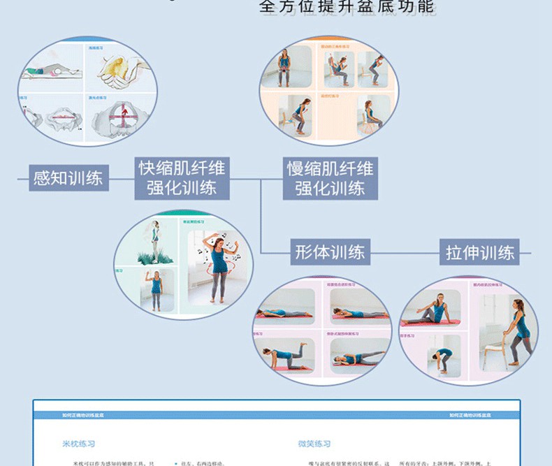 感覺識別練習、柔韌練習、強化練習及協調練習,讓女性更清楚如何發現和重建盆底功能