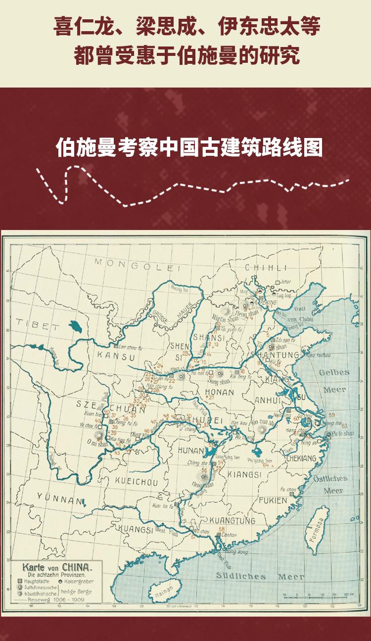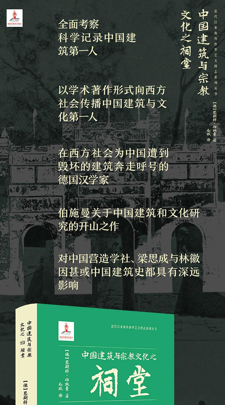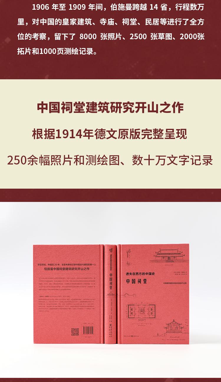 伯施曼早梁思成、林徽因20年,全面考察記錄中國古建築*人中國祠堂建築研究開山之作,收錄250餘幅插圖和照片、數十萬字的文字描述和闡釋,具有極高史料價值和 藝術價值伯施曼是中國傳統建築的偉大記錄者。 伯施曼與中國傳統建築結緣,和1900年中國爆的一場轟轟烈烈的義和團運動有著密切的關係。 義和團運動不僅深刻改變了中現代政治走向,也影響了西方人對中國的態度,當時的德國人就迫切地想了解中國社會和文化。 伯施曼正是在這樣的背景下,申請到了德國基金會的讚助,1906年踏上中國土地,開展了為期三年的田野調查,「從科學和人類學的角度,採用當時較為專業和的 田野調查方法,透過攝影、測繪和測繪草圖的方式,可觀地記錄了清末中國大地上的自然與人為環境中的宗教建築」。 伯施曼考察從北至南,行踪遍及北京、直隸、山東、山西、陝西、四川、兩湖、兩廣、福建等14省,留下了8000 張照片、2500 張草圖、2000張拓片和1000頁 測繪記錄。 伯施曼返回德國後,開始系統整理這些考察資料,陸續出版了六部有關中國古建築的專著,《中國祠堂》即是其中重要的一本。 他考察了具代表性的祠堂建築,包括黃帝祠、張良廟、武侯祠、關帝廟、李杜祠、二曾祠、二王廟、孔廟等。 1914年,《中國祠堂》出版,收錄250餘幅精美照片和測繪草圖,系統總結了祠堂研究的成果。 《中國祠堂》是中國祠堂建築研究的開山之作,其所記錄的祠堂建築有些已經毀於戰火,有的已不復存在百年前的原貌,而這些“消失”的古建築,我們今天只能 從伯施曼的記錄中得窺原貌,因此具有極高的史料價值和藝術價值。 伯施曼對後來的中國古建築研究影響深遠。 梁思成在美國賓州大學時曾研讀過他的著作,伯施曼的著作和研究方法啟發和影響了梁思成及整個創造學社的研究走向。 日本學者如小川一真、關野貞、伊東忠太,歐洲學者如喜仁龍、艾術華、梅爾徹斯和艾鍬風,他們接過伯施曼點燃的知識火炬,並將其傳遞下去。 中國現有文物遺產保護的大致框架也受益於他的精神。 伯施曼去世70年後,所著《中國祠堂》終於翻譯出版,以紀念這位中國古建築的偉大記錄者。