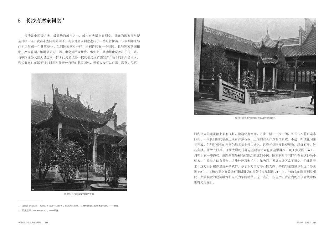本書是《中國建築與宗教文化》第二卷,初版於1914年,共收錄200餘幅手繪圖和照片,40餘萬字的描述和闡釋。作者以祠堂為研究對象,參照歐洲梳理建築及藝術文物的思路,按地域省份分類,細緻而又深刻地描述了中國黃帝祠、張良廟、二郎廟、武侯祠、關帝祠、李杜祠、文廟等各級各類祠堂的概況、歷史、建築特點及宗教文化,闡述了中國人的人與自然、建築、宗教和諧統一的世界觀和美學觀。