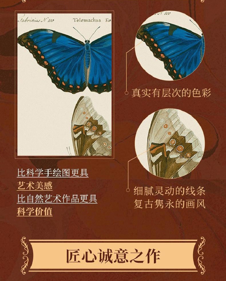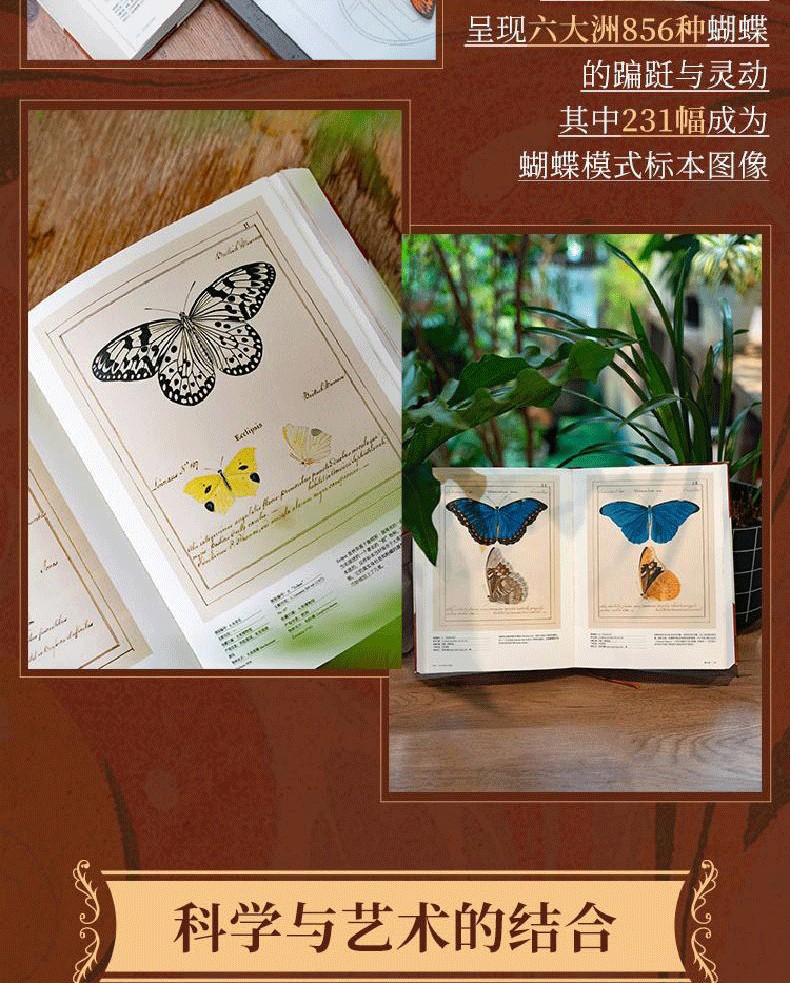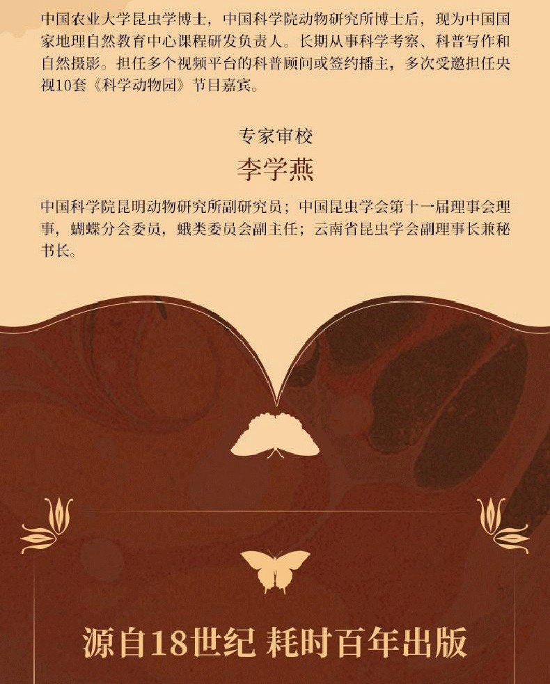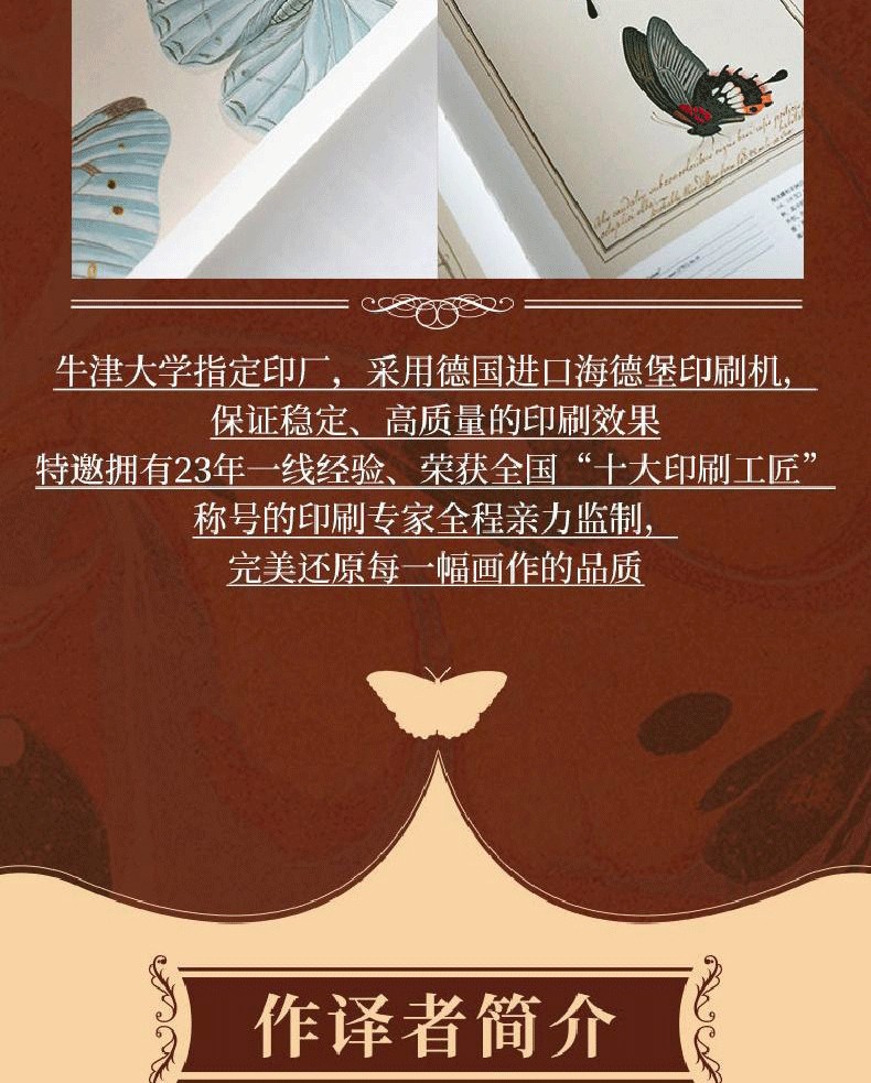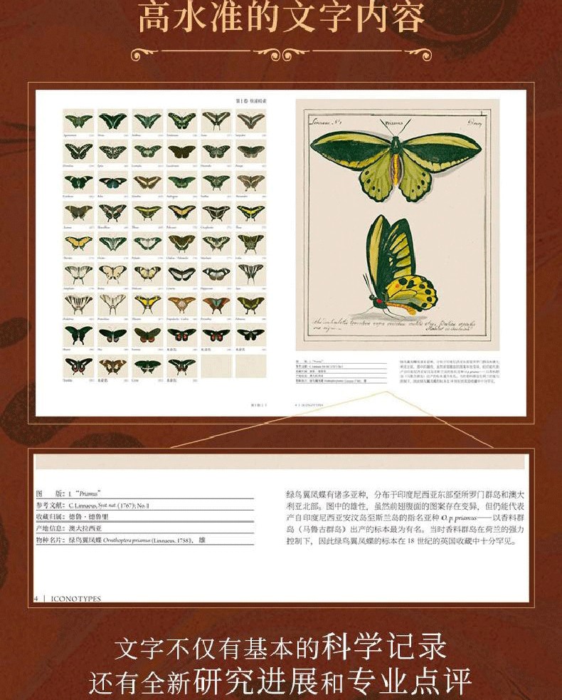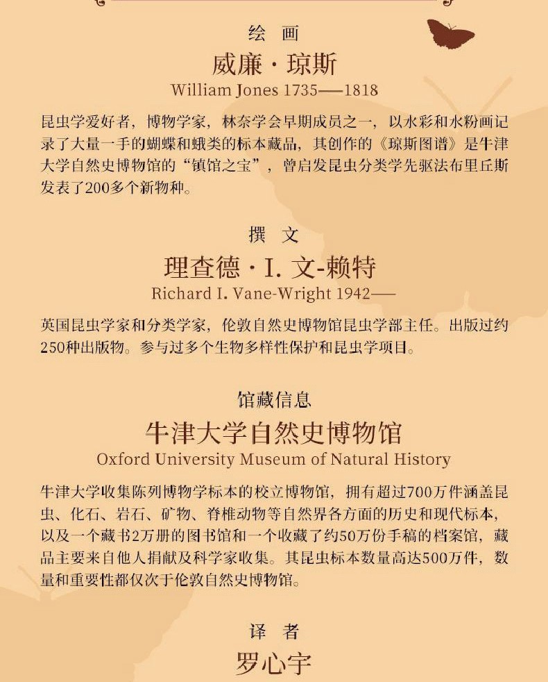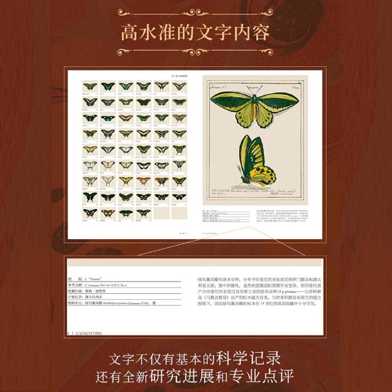 文字部分由牛津大學權威昆蟲學家理查德·I·文-賴特完成,保留並梳理了瓊斯的原始記錄,增加了對原書資料的考證和鱗翅目研究進展,根據*的分類系統定名和 資訊考證,提供了現代分類學名稱以及物種註釋,方便讀者閱讀。 此外,本書也間隔散佈著6張分佈資訊圖,顯示每個物種的位置,方便直觀了解蝴蝶的世界分佈。