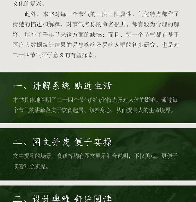 《物候心語》具體闡述了每一個節氣的氣化特點及對人體的影響,每一個節氣都有基於醫療大數據的易患疾病和易病人群的講解,以及有調心用藥、飲食起居的分析建議;每個節氣的民俗及社會生活講解皆落實於修養身心,對我們現代每個人的身心健康都是一種很好的指導。