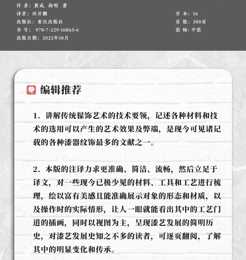 3.本書出於兩位巧匠之手,全為經驗之談,是對漆藝的現代發展至今仍有切實影響的傳世名作。