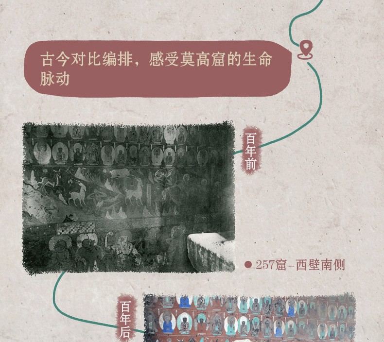 公元366年,樂僔開始開鑿莫高窟洞窟。此後的1500多年,莫高窟身處東西方文明的交匯之地,各民族和宗教的交叉點,興榮交替直至被人遺忘了幾百年。從1900年6月藏經洞被重新發現到現在的這120多年,敦煌學逐漸興起,莫高窟從默默無名到成為世界文化遺產的歷史遺珠,經歷了一個世紀,其中既有大自然的風霜雨雪沙對莫高窟的侵蝕,也有國家的動盪、殘酷的戰爭等人為因素帶來的干擾破壞。這一個多世紀,濃縮了莫高窟所經歷的漫長歲月,也是莫高窟建成以來變化劇烈的一個世紀。通過120年時間跨度的影像對比,我們可以看到那些留下的、那些逝去的永遠不可再見的,那些被破壞的;可以看到莫高窟生命脈搏的跳動;聽到她的心跳和呼吸;看到一代代的敦煌守護者為什麼而奉獻,而著迷。我們看到的,並不是遺跡和死掉的壁畫,而是活生生的歷史和生命脈動。