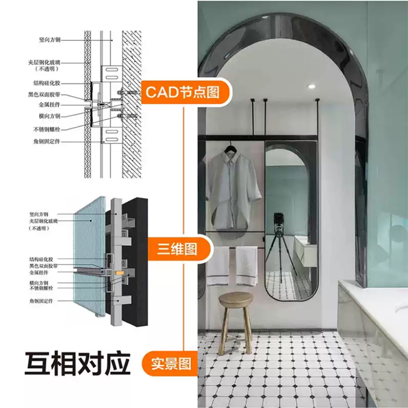 在深化設計中,節點是不可或缺的部分。雖然節點看起來是一個局部的內容,但實際上其提供的資訊十分豐富,可以說,最終的落地效果和施工品質很大程度上都依賴於節點圖。節點圖分為面層、中間層和底層三個部分,面層就是人肉眼可看到的裝飾材料;中間層則由骨架和填充材料組成,規定了一些施工材料的安裝厚度;底層即經過打毛或其他處理的原建築結構。理解好這三層結構,節點就十分簡單了。