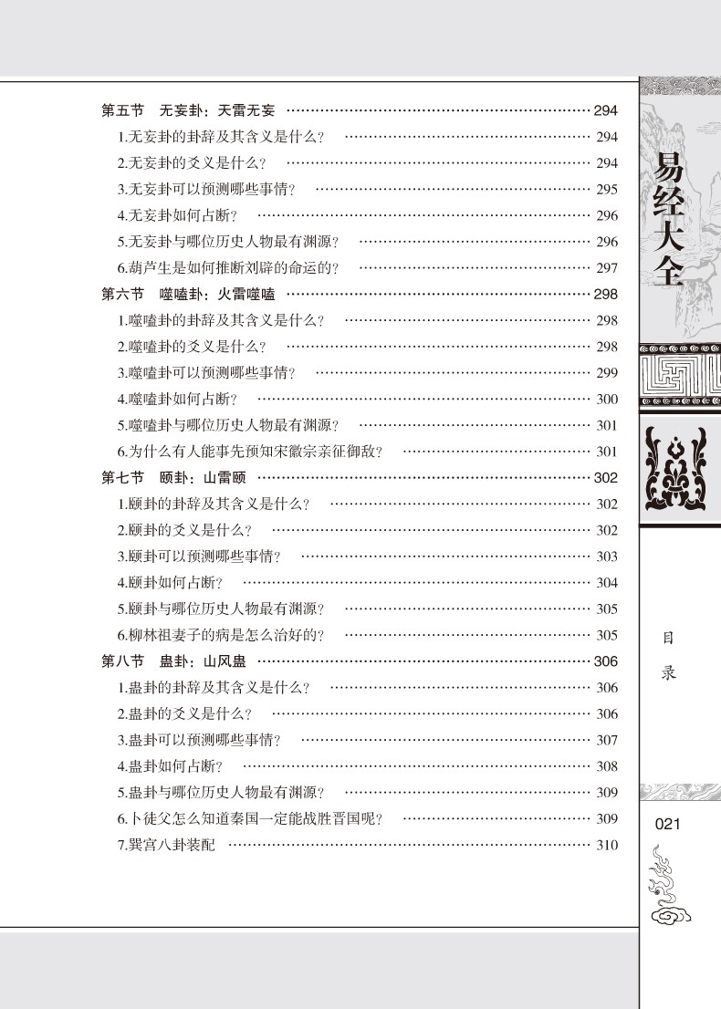 《易經大全:30天學會易經》共分上下兩篇,上篇《《易經》統論》闡釋了《易經》的內涵和外延,讓讀者真正明白《易經》所來、所 述、所含,影響範圍之廣之深;下篇《《易經》六十四卦斷易天機》為六十四卦的詳細解析和占斷,讓艱澀的古文瞬間變得清晰可讀, 其中所涉及的佔斷之事也關係到生活的各個層面,幫助讀者收割理想人生。 附錄是《易經》原文,方便有需要的讀者查閱。 為了讓讀者更方便地習得《易經》的精髓,《易經大全:30天學會易經》採用了一問一答的形式,近六百個易學問題,幫助讀者成為易學高手。 總之,《易經大全:30天學會易經》是一本不可多得的易學普及讀物,深入淺出的講解方式,圖文並茂的編排方式,讓讀者能真正讀懂並學會運用《易經》,在人生 旅途中一帆風順。