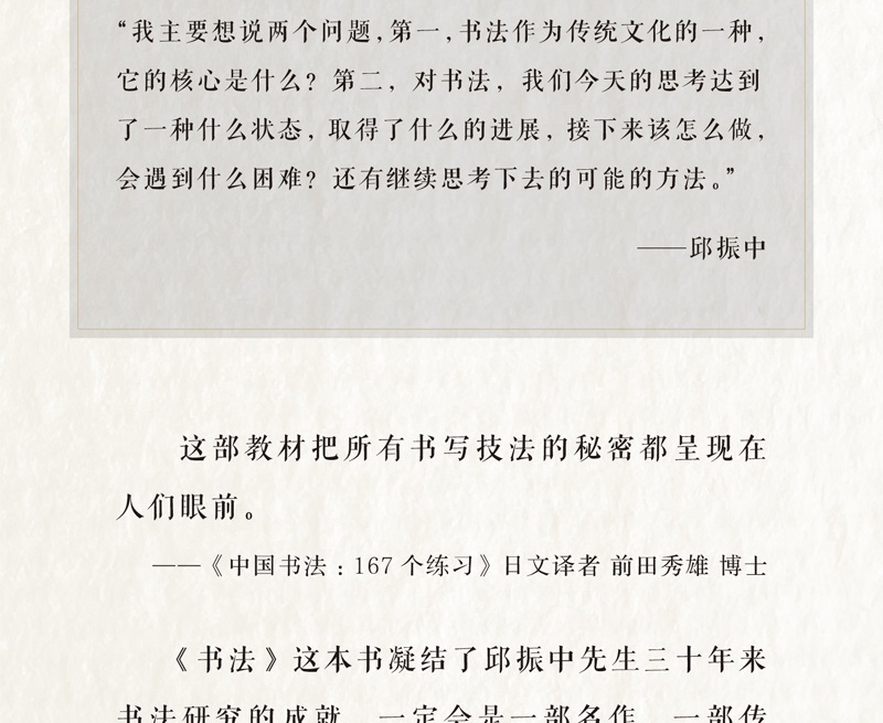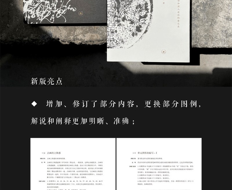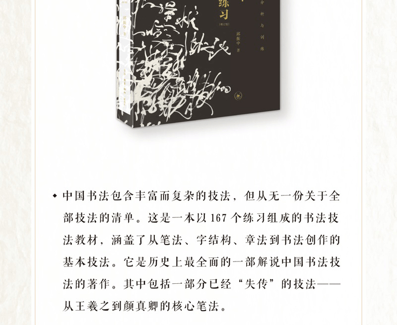 中國書法包含豐富而複雜的技法,但從無一份關於全部技法的清單。 這是一本以167個練習組成的書法技法教材,涵蓋了從筆法、字結構、章法到書法創作的基本技法。 它是歷史上z全面的一部解說中國書法技法的著作。 其中包括一部分已經“失傳”的技法——從王羲之到顏真卿的覈心筆法。