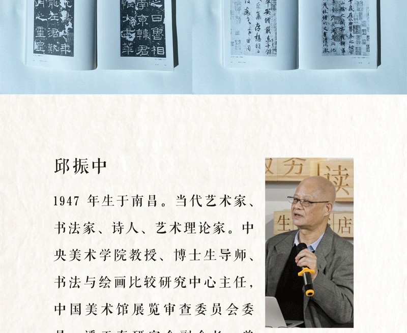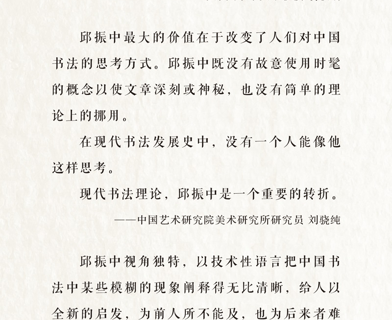 邱振中,1947年生於南昌。 當代藝術家、書法家、詩人、藝術理論家。 中央美術學院教授、博士生導師、書法與繪畫比較研究中心主任,中國美術館展覽審查委員會委員,潘天壽研究會副會長。 曾任北京奧運會開幕式水墨顧問,日本文部省外國人教師、國立奈良教育大學客座教授。 於北京、日內瓦、奈良、香港等地多次舉辦個人作品展覽,參加國內外多種重要展覽。 獲“中國書法蘭亭獎”理論獎、教育獎、藝術獎。 獲第十届“上海文學獎”詩歌獎、韓國全北世界書藝雙年展金獎。 著有《書法的形態與闡釋》《神居何所》《書法》《中國書法: