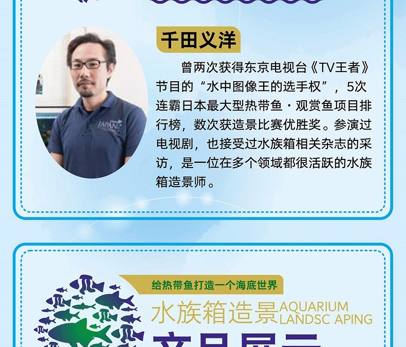 千田義洋,曾兩次獲得東京電視台《TV王者》節目的“水中圖像王的選手權”,5次連霸日本**型熱帶魚·觀賞魚項目排行榜,數次獲造景比賽優勝獎。參演過電視劇,也接受過水族箱相關雜誌的採訪,是一位在多個領域都很活躍的水族箱造景師。