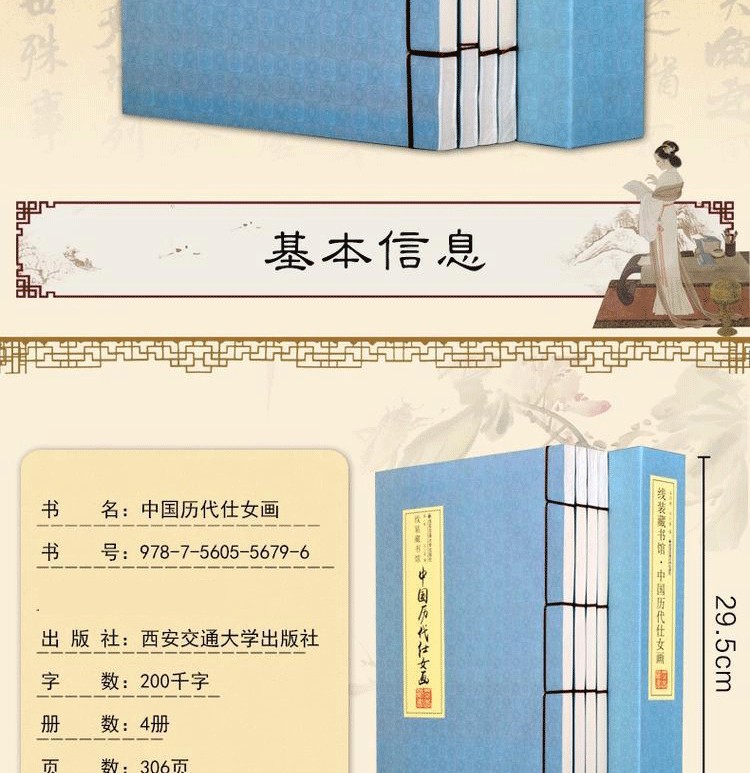 仕女畫是人物畫中以女性形象為描繪對象的繪畫,直到六朝時期,它才作為一個獨立的畫科正式誕生。 《中國歷代仕女畫(套裝全四卷)》精心選取從東晉到近現代仕女畫共一百六十餘幅,每幅畫作除標明材質、尺寸、藏地外,還對畫家做了大致的介紹。另外,在「仕女風韻」欄位中可結合文字品味畫面中女子的濃妝淡抹及如何搖曳生姿。在「畫中千古事」中,可尋得畫作裡的背景知識、故事與傳說。倘若讀者來了興致也想繪製一幅心中的仕女畫,可在「丹青妙筆」中尋求大師的繪畫技巧。到目前為止,《中國歷代仕女畫(套裝全四卷)》可謂是跨越年代最長,資料最為詳備的仕女畫書籍之一。
