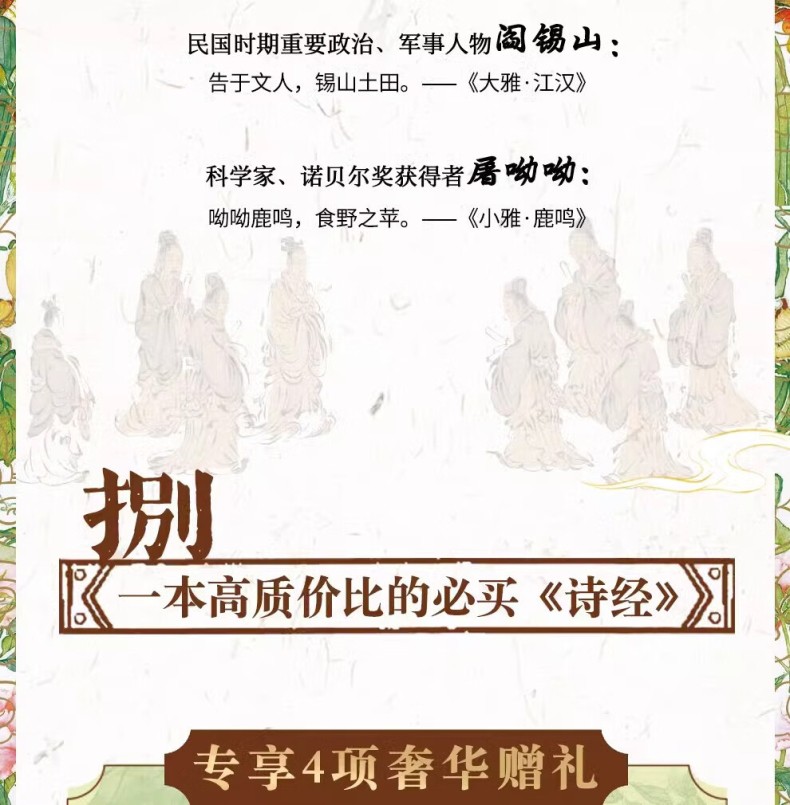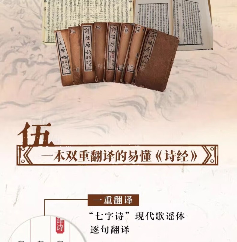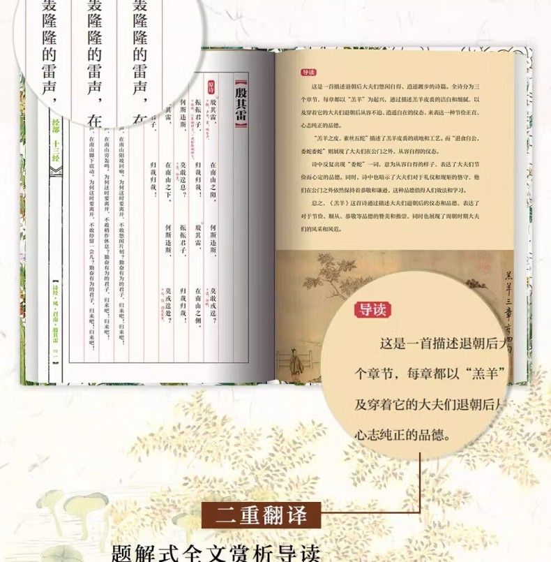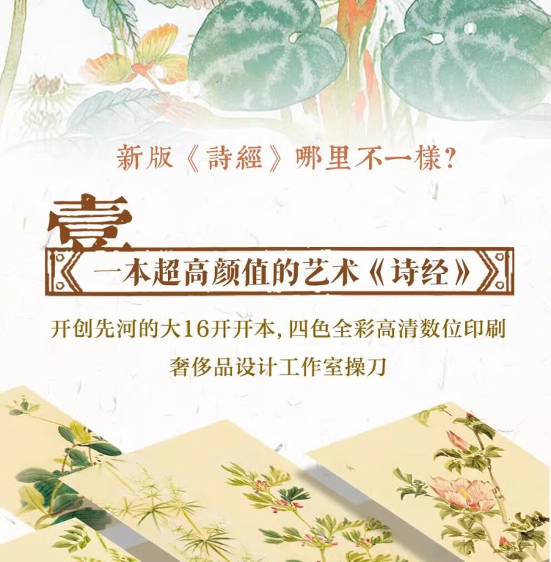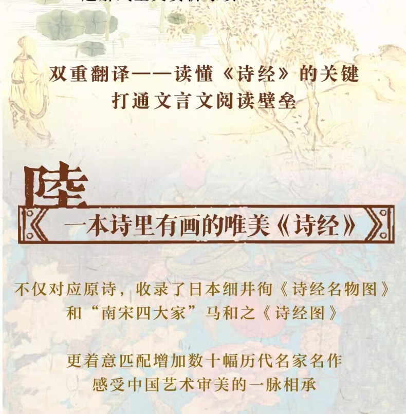 本書包括上、下兩冊。本次出版的《詩經》既是文學巨著,也是藝術畫冊。本書特別收錄了馬和之、乾隆版等多個經典版本的詩經插圖,他們以獨特的藝術視角,生動再現了詩歌中的經典場景。並且收錄了原著的全部內容,更邀請了權威專家對每一篇詩歌進行詳盡的導讀、註釋和解讀,深入剖析詩歌背後的歷史文化內涵。我們這部全新版本的《詩經》,將帶領讀者領略中華文化的博大精深,感受古代詩歌、繪畫的無窮魅力。無論是文學、藝術愛好者、研究者,或是對中國傳統文化有興趣的讀者,都能從中獲得深刻的啟示和美的享受。