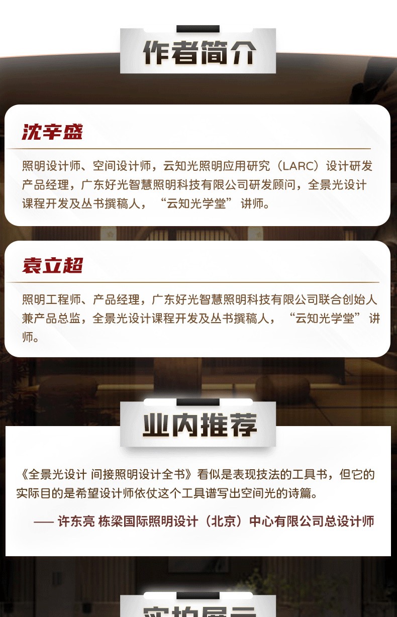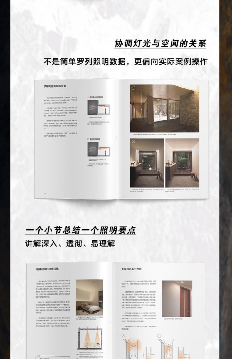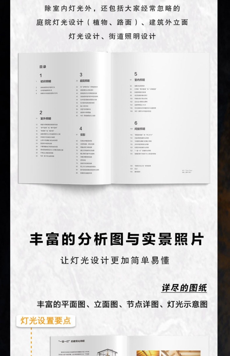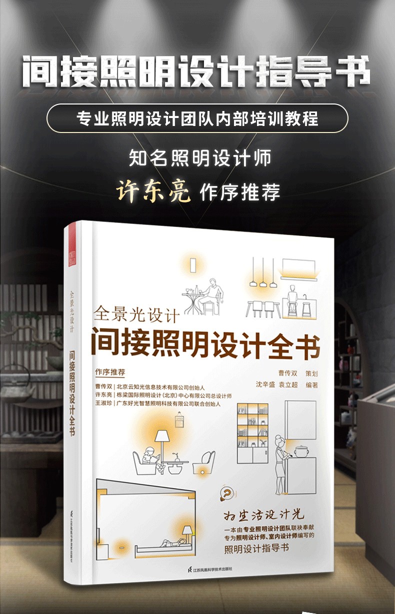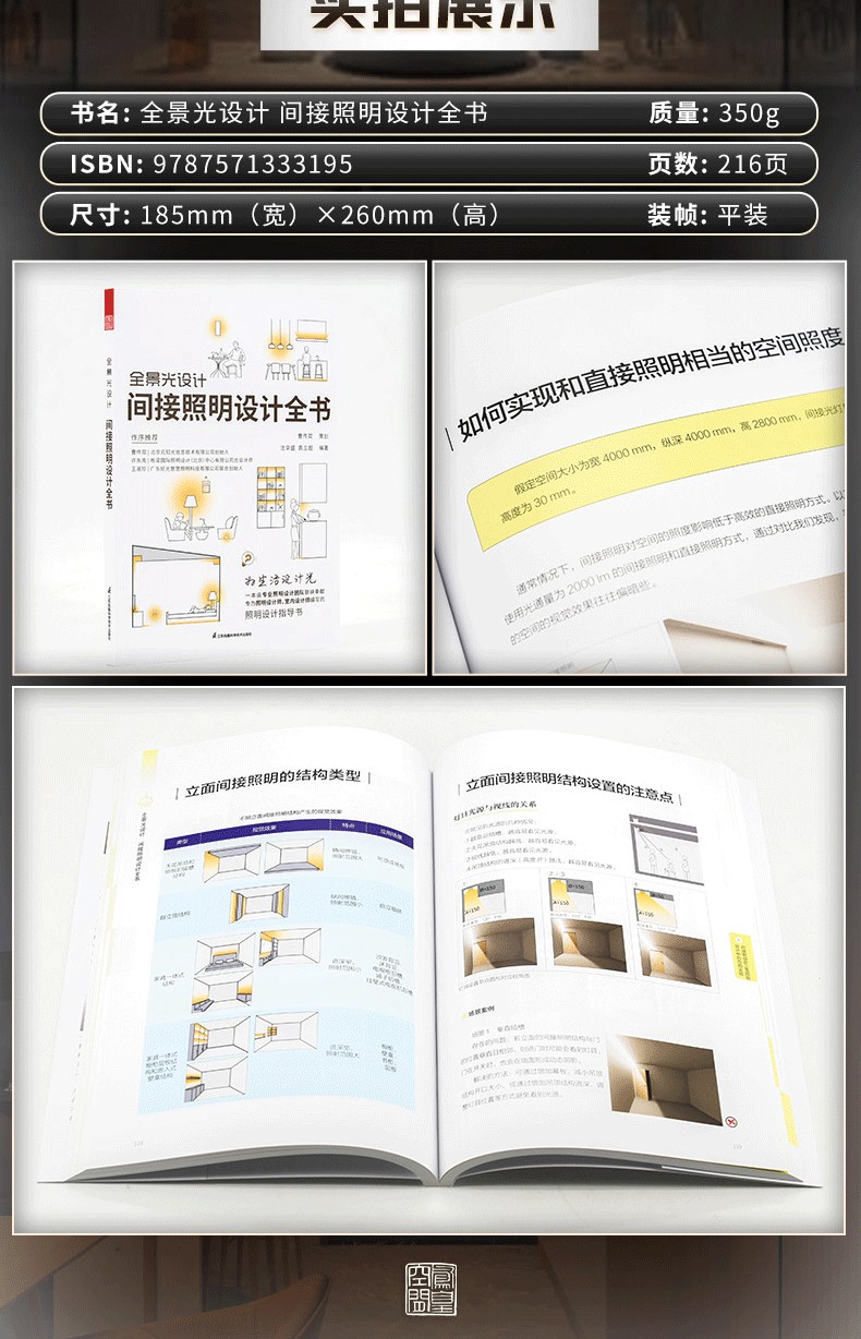 間接照明是室內照明設計中重要的用光手法,與目前火熱的所謂「無主燈」概念相似,都是注重空間整體的視覺體驗。 但其底層邏輯卻有著根本性的不同,相較而言,全景光設計理論體系中的間接照明設計 系統、科學、可落地,有著 深遠的設計實踐指導意義。 1.內容系統。 “以人為本”,對空間和行為進行梳理和 整合,以場景營造來滿足人們日常的視覺、情感和健康的光環境需求。 2.易讀易懂。 用淺顯的語言訓訓道來,用明晰的圖表和300張燈具安裝示意,圖解場景營造的方法。 並藉用經典案例和 闡明光與空間、建築、自然以及人們之間的關係。 3.職前訓練手冊、實操寶典。 過去室內設計師在設計完一個空間後,才會去思考空間的燈光,但往往到了那個階段,留給燈光發揮的空間已經很有限了。 這本保姆等級教學有助於設計小白從零基礎入門室內間接照明設計,少走彎路少踩坑。 經驗豐富的設計老司機也不妨在桌上放一本實操指南,方便翻閱,一目了然。