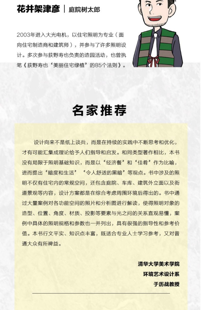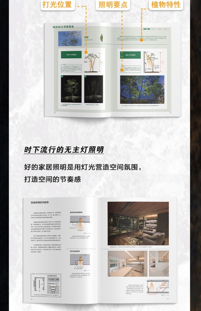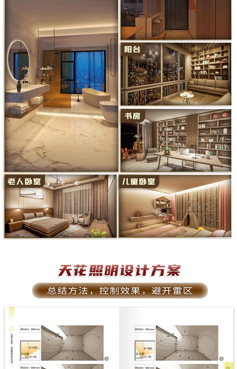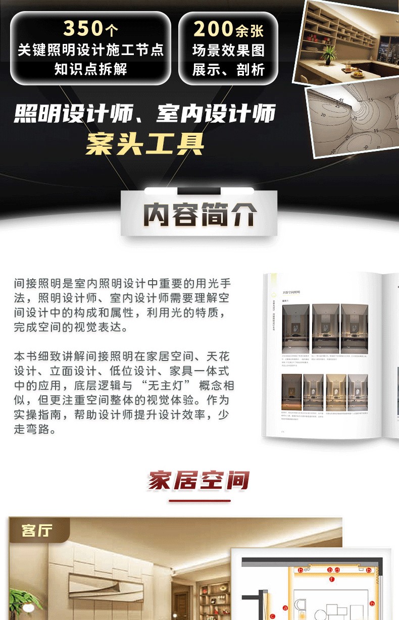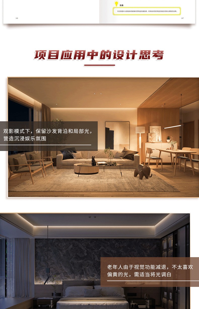 間接照明是室內照明設計中重要的用光手法,與目前火熱的所謂「無主燈」概念相似,都是注重空間整體的視覺體驗。 但其底層邏輯卻有著根本性的不同,相較而言,全景光設計理論體系中的間接照明設計 系統、科學、可落地,有著 深遠的設計實踐指導意義。 1.內容系統。 “以人為本”,對空間和行為進行梳理和 整合,以場景營造來滿足人們日常的視覺、情感和健康的光環境需求。 2.易讀易懂。 用淺顯的語言訓訓道來,用明晰的圖表和300張燈具安裝示意,圖解場景營造的方法。 並藉用經典案例和 闡明光與空間、建築、自然以及人們之間的關係。 3.職前訓練手冊、實操寶典。 過去室內設計師在設計完一個空間後,才會去思考空間的燈光,但往往到了那個階段,留給燈光發揮的空間已經很有限了。 這本保姆等級教學有助於設計小白從零基礎入門室內間接照明設計,少走彎路少踩坑。 經驗豐富的設計老司機也不妨在桌上放一本實操指南,方便翻閱,一目了然。